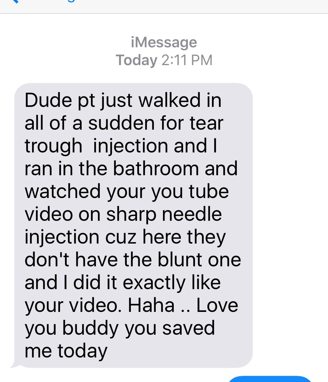 Dude pt just walked in all of a sudden for tear trough injection and I ran in the bathroom and watched your you tube video on sharp needle injection cuz here they don’t have the blunt one and I did it exactly like your video. Haha ..Love you buddy you saved me today